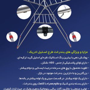 بند رخت ادریک مدل استیل با طراحی بال‌دار و بدنه‌ای از استیل ضد زنگ، انتخابی بادوام و شیک برای خشک کردن لباس‌هاست. سبک، تاشو و مقاوم در برابر رطوبت — مناسب برای فضای داخل خانه و بالکن.